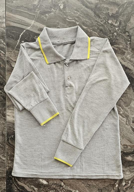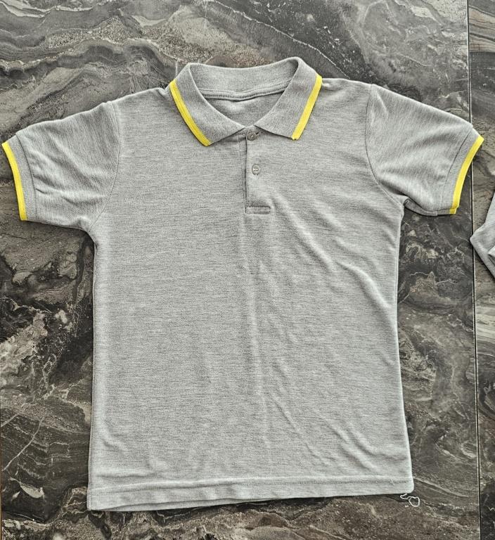 Okul üniforması yaka ve kollarda sarı çizgili gri renk tişört ve...